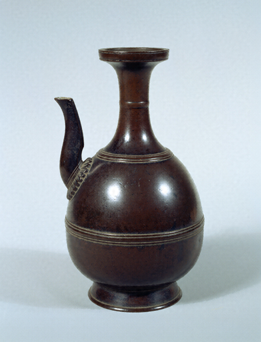 布薩とは説戒の意で、僧侶が毎月15日に布薩堂などに集まって戒本を説き、戒を守らなかった者がある時は懺悔させる法会。布薩形水瓶は法会の最初に心身を清めるため手を洗うのに用いるもので、仏前供養具として用いられる水瓶とは性格が異なる。布薩形水瓶は仙盞形水瓶をもとにわが国で創案されたものと考えられる。本品は典型的な形式の布薩形水瓶で、高台に下膨れのたっぷりした胴をのせ、肩に短めの注口をつけ、口縁が朝顔形に開いた頸をもつ。当初は尖台(飲み口付きの蓋)を具していたものと推定される。注口は全面に稜を立て、背面を三方面取りを施しており、基部に菊座を据えている。頸、肩、胴の三個所に子持ち紐帯を巡らす。総体に厚手に作られ、胴張りも顕著で重厚な作風を見せている。