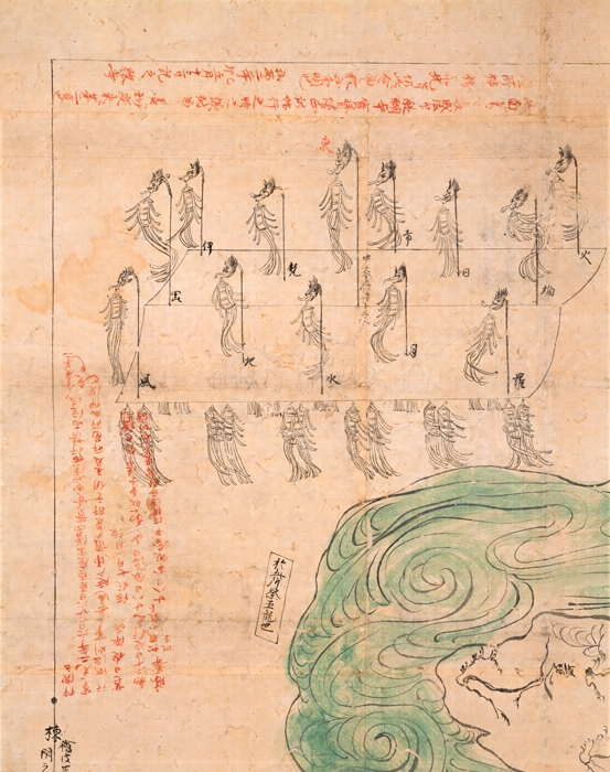 京都の神泉苑において、延応二年(一二四〇)に醍醐寺座主の実賢(一一七六~一二四九)が主催して執り行われた、請雨経法(雨乞い)の様子を描いた図。当時につくられた原図は残らず、本品はその写しである。中央やや上よりに池があり、中島が浮かんでいる。池の水が渦を巻いて流れる様を墨線で表し、さらに白緑で彩色する。池の下方(北)には請雨の壇所である「仮屋」や、立ち並ぶ13本の幡などが描かれ、修法の本尊として孔雀明王像が懸けられたことも見えている。幡が立ち並ぶ様子は、池の上方に拡大されて再び描かれる。現在知られている神泉苑の古図には、本品より古い年紀を持つものもいくつかあるが、これほど精緻に描かれたものは他に例がない。神泉苑の図として、また鎌倉時代における請雨経法の実際を知る資料として価値が高い。なお、画面左上の朱書によれば、本図は、実賢による修法から四十年近くを経た弘安二年(一二七九)に、西大寺中興の祖である叡尊(一二〇一~一二九〇)が描いたという。実際に叡尊が筆を執ったか否かは不明だが、本図の成立に彼が大きな役割を果たしたことは間違いなかろう。