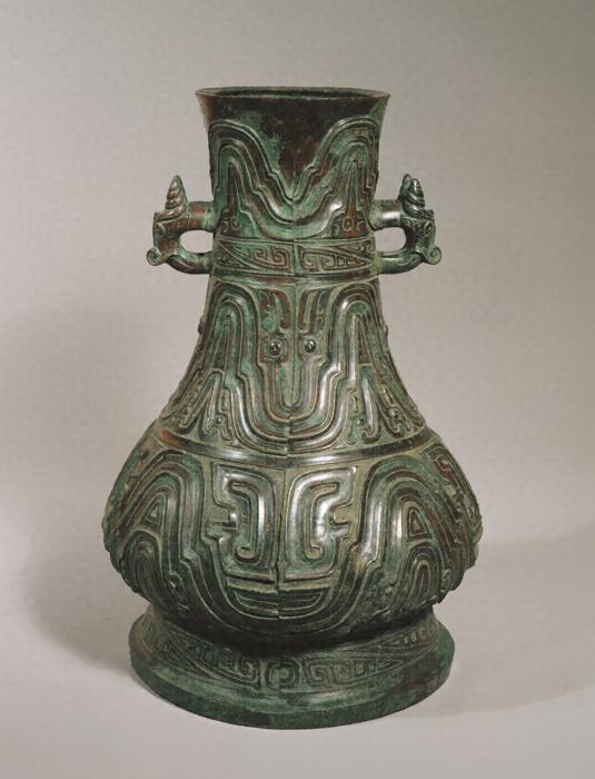 西周期の壺(こ)は、実際は商代後期の卣(ゆう)から発達したものであるが、提梁(ていりょう)を取り付ける両耳の部分などが時代とともにさまざまに変化してゆく。この壺は、西周後期から春秋期初頭のかなり大型のもので、頸部が細く腹部が膨らんでいて全面に波のような曲線文がうねっている。この文様は商代以来の尖葉文が丸みを帯びて変化したものと考えられるが、本来の尖葉文内部の獣面表現も退化してしまっている。