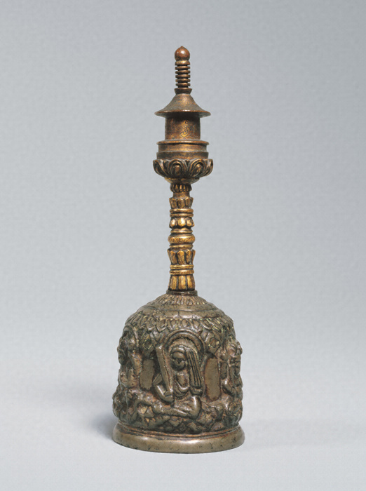 鈴身(れいしん)部分と把(つか)・宝塔(ほうとう)部分とを別々に鋳造し接合した宝塔鈴。鈴身は白銅製で、側面に半肉状の五大明王坐像(ごだいみょうおうざぞう)を鋳だしている。不動明王(ふどうみょうおう)以外の尊名は特定しがたいが、不動、烏枢沙摩(うすさま)、降三世(ごうざんぜ)、軍荼利(ぐんだり)、大威徳(だいいとく)の五大明王を表したものかと推定される。明王はいずれも動きを抑えた大人しい表現に特徴があるが、近似する表現の明王像を有する金剛鈴(こんごうれい)を韓国・国立慶州博物館所蔵の金銅四大明王五鈷鈴(こんどうしだいみょうおうごこれい)や奈良・正暦寺所蔵の金銅二大明王五鈷鈴(こんどうにだいみょうおうごこれい)など高麗時代の明王鈴にも見ることができ、本品もこの時期の製作と推定される。わが国では鈴身を白銅製とする金剛鈴は鎌倉時代以降普及するが、高麗時代の金剛鈴にも類例が見られることは、わが国の白銅鈴の成立を考える上で興味深い。なお、把と宝塔部分、舌(ぜつ)は後補と推定される。東京国立博物館に類品が所蔵されている。