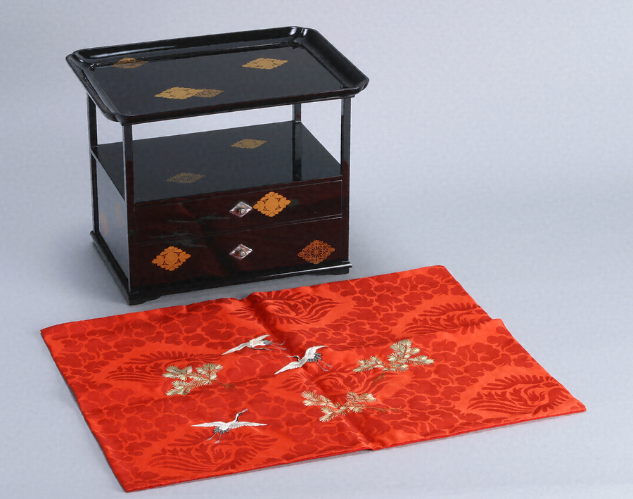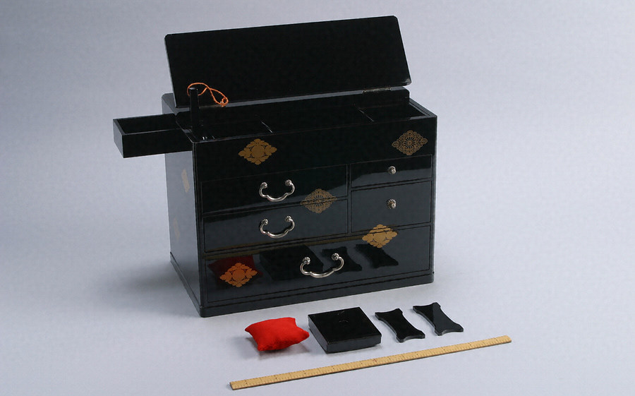 13代鍋島直泰夫人紀久子の婚礼調度の一つ。箪笥や長持、文房具や化粧道具、飲食具など、24種類(うち22種類が現存)もの調度類すべてに朝香宮家の家紋を付け、納品に際しては「精々入念御調製」した旨を記している。黒江屋漆器店は元禄2年(1689)創業とされる老舗の漆器店で、現在も日本橋に店を構えている。黒江屋の商標は丸に柏マークであるが、これは19世紀初頭に呉服小間物屋の柏屋に経営権が移ったことに由来している。