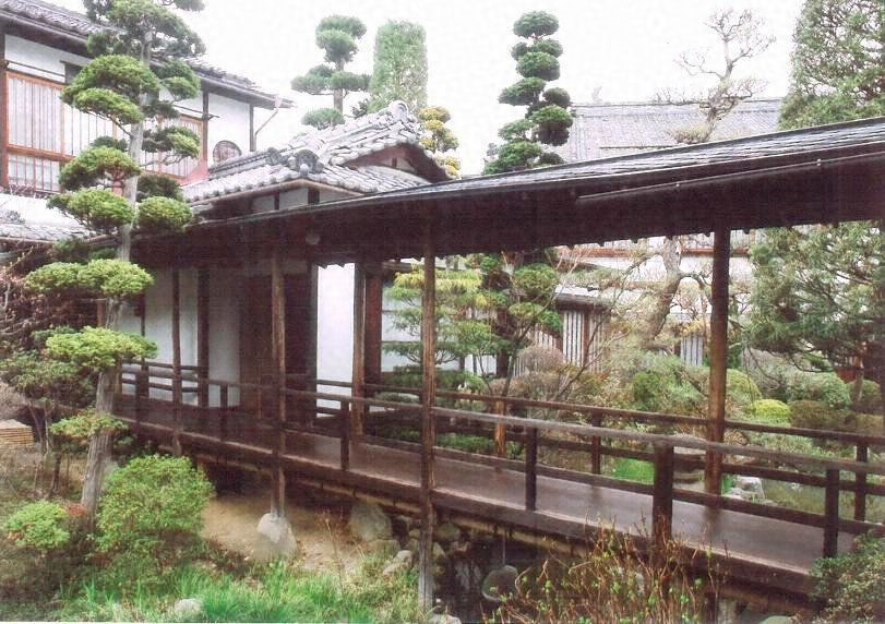 南渡廊下西寄りから本館に延びる渡廊下で,長さ22m,幅1mの規模で,木造,切妻造,銅板葺とする。丸太柱に梁を架け束立てとする形式と,むくりを付けた梁に棟木を架ける形式を使い,柱間に手摺を設ける。数寄屋風の簡素な造りで,庭と一体の景観を形成。