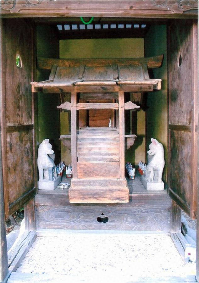 敷地北半部のほぼ中央に位置する木造平屋建。丸石積の基壇の上に建つ間口3尺5寸の方1間の建物で,向拝柱を立てて流造の屋根を架け鉄板葺とする。内部は板床を張り,江戸期製作と推定される稲荷社を祀る。外壁は真壁造白漆喰塗で,正面に両開板扉を吊り込む。