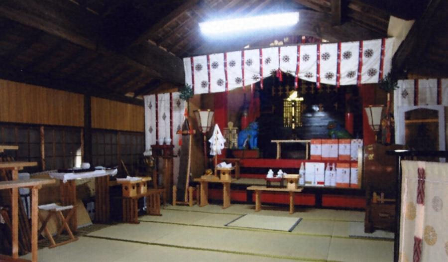 本殿の正面、神楽殿後方に繋がる社殿。梁間は神楽殿と同寸で、桁行は3間。屋根は桟瓦葺で、中央2間は北面が切妻造、南面が両下造、両側面半間を下屋とする。正・背面開放で、側面には窓を開ける。内部は畳敷の1室で、天井は化粧屋根裏とする。