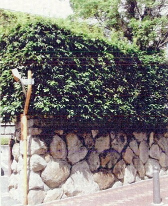敷地の東辺、出入口を挟んで南北に延びる石垣で、折曲り総延長36m、高さ2m内外である。基部を大振りな花崗岩の練積、その上に切石を帯状に置き、上部を玉石の練積とし、生垣を植える。閑静な住宅街に調和した景観をつくる。
