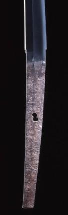 鎬造、庵棟、腰反り浅く、鋳鋒。鍛小板目の肌約り乱映り立つ。刃文中直刃仕立に、互の目ごころの小乱れ交じり。足入り匂口締まる。帽子僅かに湾れ込み、表先少しく尖りごころ、裏小丸。茎生ぶ、先栗尻、鑢目筋違い、目釘孔一。表裏に銘あり。