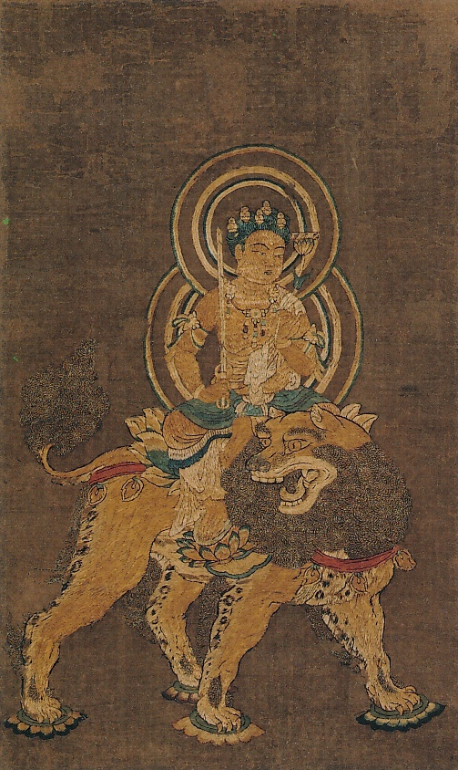 頭に五髻を、右手には智剣、左手には梵篋をのせた蓮茎をもつ通例の五髻文珠菩薩が、獅子に騎乗している図を刺繡で表している。本紙にあたる地は淡茶色の平絹地で、すべて刺し繡の技法を用い、獅子のたてがみと尾などの体毛は白と藍染糸を撚り合わせて繡い、胴は半返繡の技法で白・紅・赤・紫・浅黄染の色糸で表している。表層の一文字は神獣円文卍字繋文金襴、中廻は花文菱形繋文緞子で、当初の表装と考えられる。
