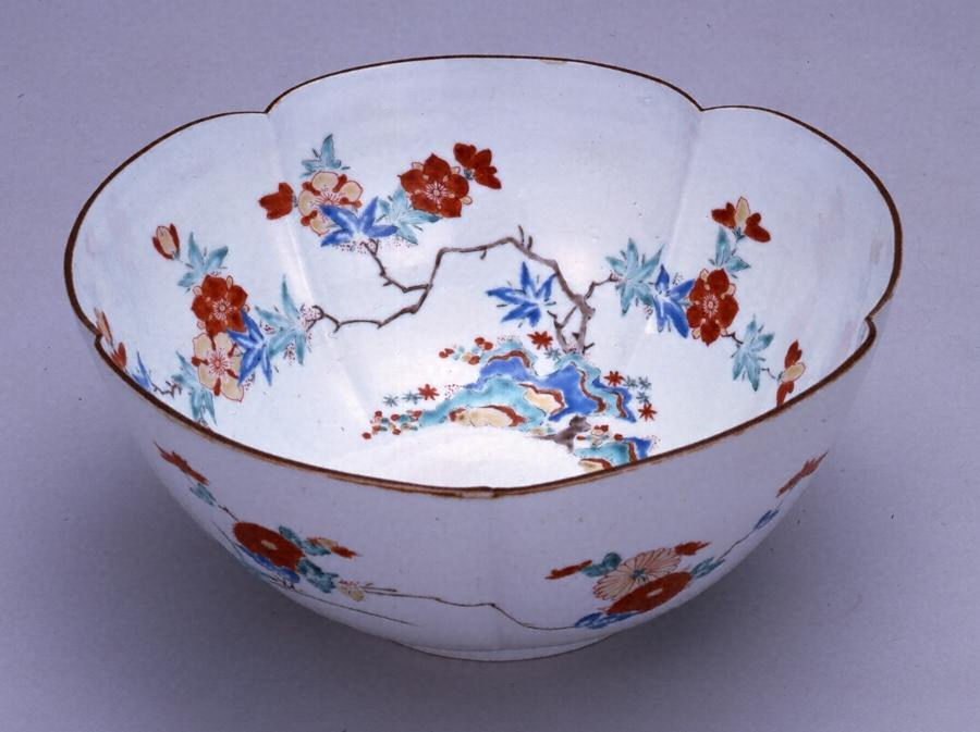伊万里磁器のなかで輸出用の最高級色絵磁器として発展した柿【かき】右衛門様式【えもんようしき】の作品である。濁手【にごしで】の純白の素地に余白を十分にとり、ゆったりと配した花卉文様は左右に枝を伸ばし岩を配して大小に描き分ける。内外面を巧みに組み合わせた構成で、黒の輪郭線はひかえめに用い、赤・青・青緑・茶・黄などの上絵貝【うわえのぐ】で賦彩【ふさい】されるが、その色調にはかげりがなくまことに色鮮やかなものである。型づくりによる端正【たんせい】な形姿【けいし】と洗練された瀟洒【しようしや】な雰囲気をもつこの色絵輪花鉢は、柿右衛門様式として技術的・様式的にも最も完成されたものであり、類品中特に作行【さくゆき】の優れたものである。