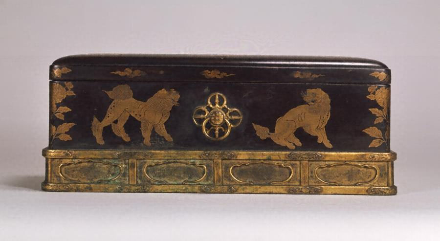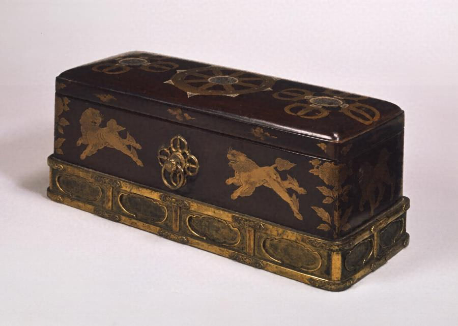 長方形、合口造り、丸角、底に台脚を付けた箱で、蓋・身は総体黒漆塗りとする。金研出蒔絵で輪宝・羯磨・雲形・獅子・牡丹などを表す。輪宝・羯磨の細部や獅子の鬚・尾などにはさらに金平蒔絵により線描され、かつ牡丹は針描で細部が表現されている。また雄獅子には金地に平目粉を散らしている。紐金具は、金銅羯磨形で丸鐶を付す。台脚は金銅装で、上下に框をめぐらし、束により長側面を四区、短側面を二区にわかち、各々に格挟間をつくっている。また各束の上下框部には金銅魚子地蓮唐草文蹴彫りの花先形八双金具を鋲止めする。箱内面と底裏は黒漆無文。