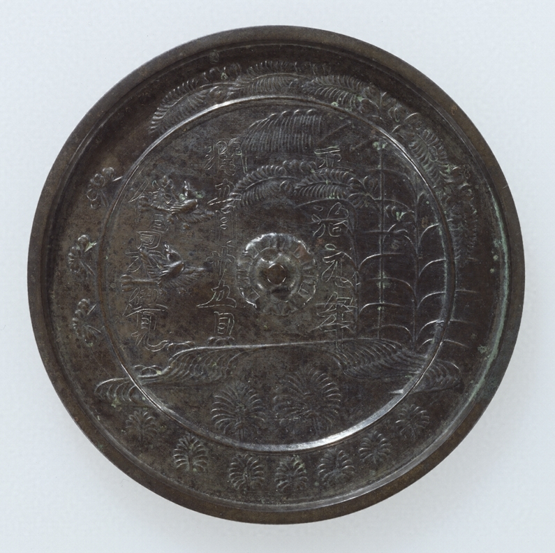 鏡の表面に神仏の像を彫り表した御正体【みしようたい】のことを鏡像と称している。本品も鏡背に、流水に萩・蝶・飛鳥・水草を鋳表した鋳上りのよい白銅質の鏡を利用している。