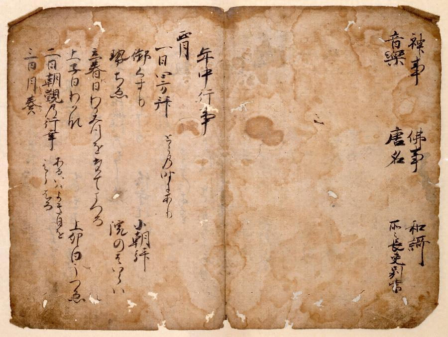 冷泉家本は上下巻を一帖とし、首尾題はない。前段(上巻)部分には「年中行事」についで、神代から第八十六代四条院までの「帝王御次第」を収める。ついで四丁分の白紙をおいて、下段(下巻)部分の頭に追号天皇を書上げ、「年号」以下「所々長吏別當」までの三十一項目を収める。巻末は延暦寺座主「円基」までで、裏表紙部分の大半を欠いている。