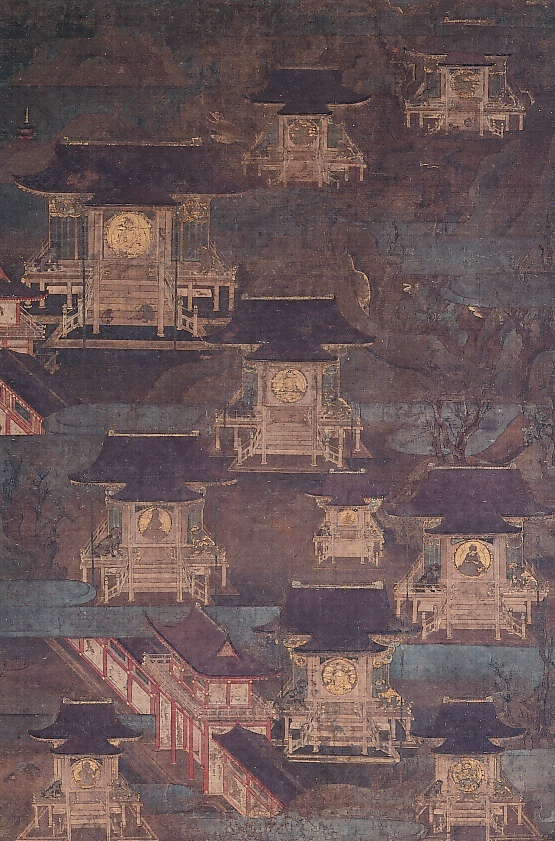 制作年代については、強い屈曲を見せる樹木の形態や、樹幹に大きな洞を描く表現は、これと類似する例が正安元年の国宝一遍上人絵伝(京都・歓喜光寺、神奈川・清浄光寺)などに見出される。また、丘陵や懸崖を複雑に組み合わせて高峻な山容を表し、さらに所々に金泥を掃いて荘厳する手法は、鎌倉時代後期の兵庫・小童寺蔵阿弥陀二十五菩薩来迎図(重文)、奈良・瀧上寺蔵九品来迎図(重文)などに近似した例が見られる。一方、御正体の尊像表現には、小さな部分ではあるがやや固さが認められ、こうした諸点から、本図の制作期は鎌倉時代一四世紀におくことができよう。
