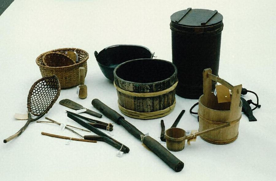 内訳:自然物採集用具143(0+143)点 山樵用具79(41+38)点 木工用具270(219+51)点 藁仕事及びその他の仕事用具156(136+20)点 諸職関係用具145(18+127)点 狩猟・漁撈用具117(72+45)点 農耕用具181(149+32)点 畜産用具42(36+6)点 養蚕用具47(43+4)点 染織用具172(163+9)点 運搬・交易用具120(74+46)点 仕事着68(64+4)点 飲食・灯火具29(29+0)点 信仰用具117(13+104)点