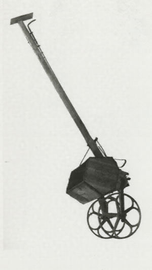 1970年8月寄贈。岡山県山陽町みのる産業株式会社みのる式播種施肥兼用機と記してある。