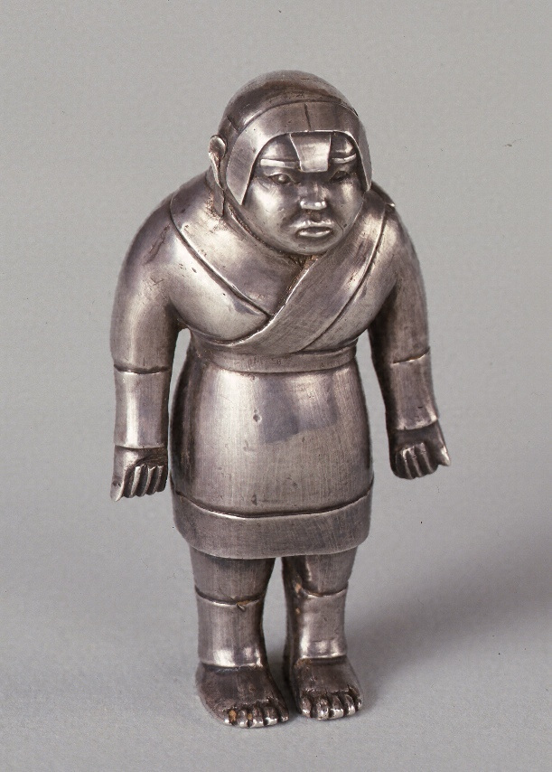 鋳銀製。正面を向き両手を下げた小形の立像である。広い額、猫背の様子など、小像でありかつ表現が内端でありながらよく特徴をとらえている。胡人の像と解され、背面の鏤刻銘には未解の文字があるが、銀の重量に関するものと推定されている。