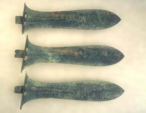 銅鋳。扁平な両刃造りの銅戈で、身の中央に不明瞭な鎬をつくり、比較的幅広い樋の基部には細かな綾杉文を鋳出す。鋒は鋭角に作り出されるが、刃部の研ぎ出しは全く行われていない。茎の片面に対の弧文が鋳出されたもの八例、直線文を鋳出すもの二例の他に、円形文、綾杉状の細線文を鋳出すもの各一例がある。遺存状態は良好だが、いずれの箇体も刃部片面の銅質劣化が著しく、かつての埋納状態が推測される。