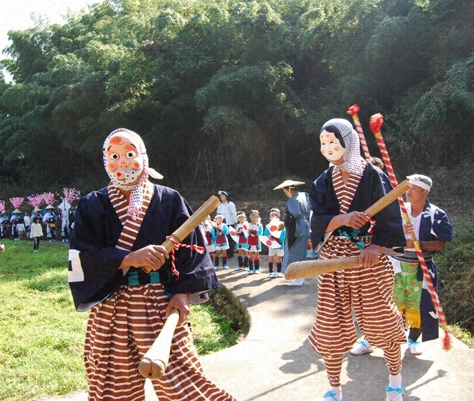 社殿前での踊りの態様は、新発意が音頭を取り、囃子はかんこの頭が取って、踊りは円陣形式で飾られる。雨乞いを本旨としながらも、極めて風流化された芸能として地方的特色の顕著なものである。