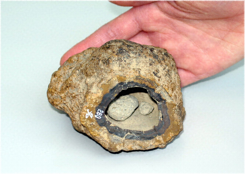名寄町郊外河成段丘ヲ成セル洪積層中ニ出ヅ 徑一、二寸ノ球形又ハ橢圓形ノ粘土質結粒ノ一種ナリ 多クハ中空ニシテ中ニ含鐵粘土ノ球粒又ハ片塊ヲ有シ之ヲ振レバ戞音アリ 此ノ種ノ鈴石ハ從來日本ノ諸處ヨリ産シタル記録アレドモ其ノ實物ニ接スルコトハ殆ンドナク名寄鈴石ノ如キ場合ハ極メテ稀ニ見ル所ナリ