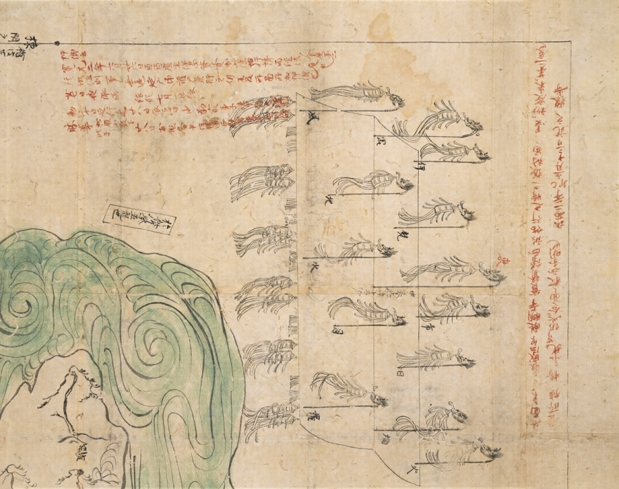 『神泉苑請雨経法道場図』は、延応2年(1240)7月、醍醐寺座主実賢(1176~1249)が平安京の神泉苑にて執り行った請雨経法の様子を描いたもので、鎌倉時代の神泉苑の実態を伝える類例稀な絵図として貴重である。苑池は緑青色に彩色され、周囲に壇所の敷設などを詳細に記している。弘安2年(1279)に西大寺の叡尊(1201~1290)が書写させたことがみえ、新たな事績としても注目される。