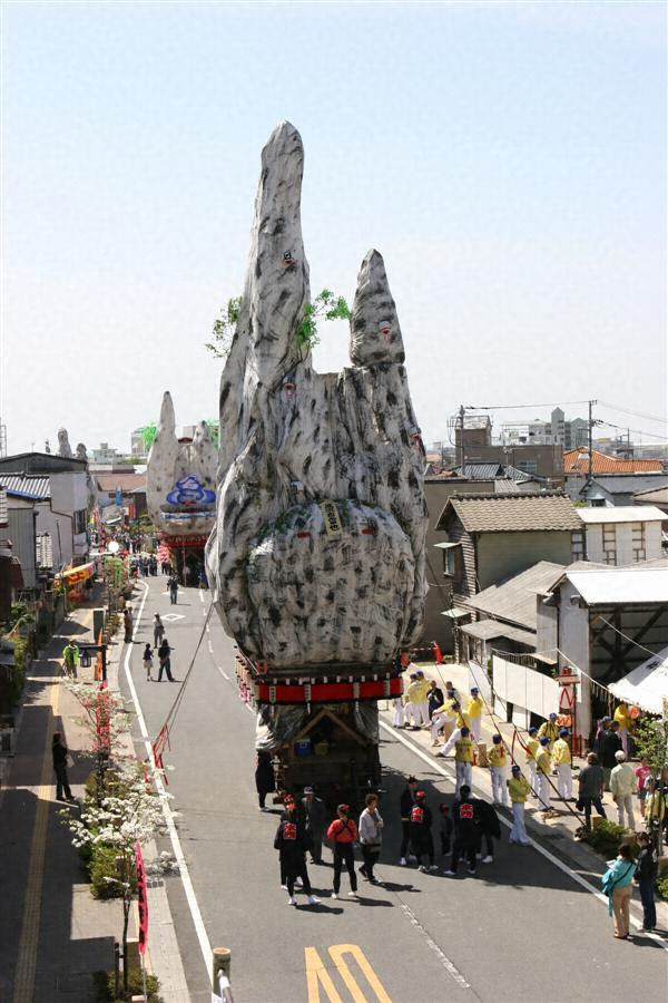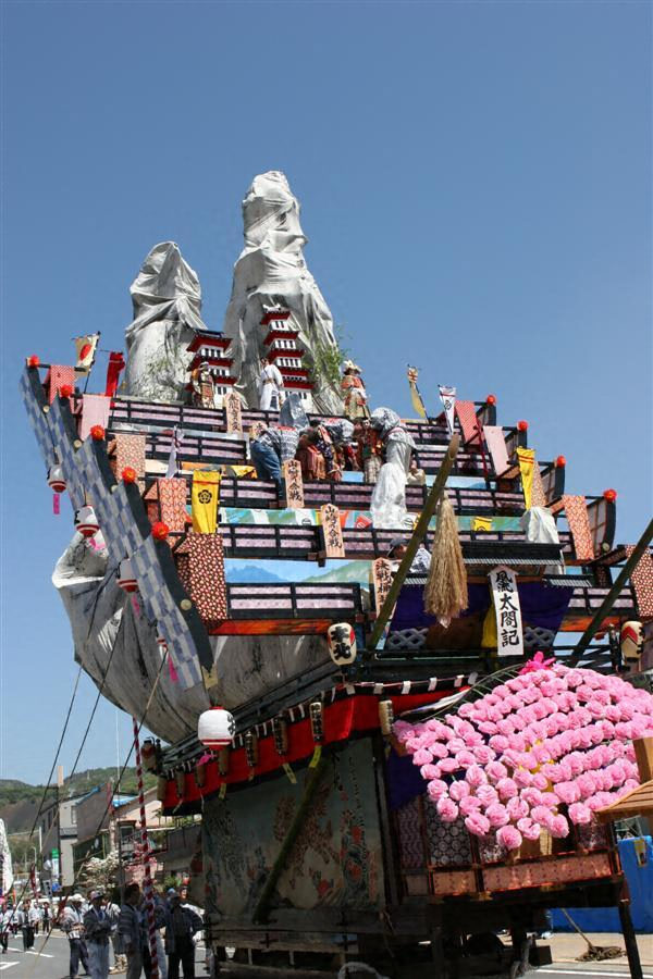 前方に幣帛をつけた青竹および花笠を残し、背面に岩山の姿を残している。前面には五層の段がつくられ、各段ごとに破風造りの屋形があってこれが左右に割れて舞台となり、そこで「あやつり人形」をつかうことができる。五層の舞台を展開させて全体を回転させる機構にも特色があり、山車の最も発達(風流化)したものの1つとして代表的なものといえる。