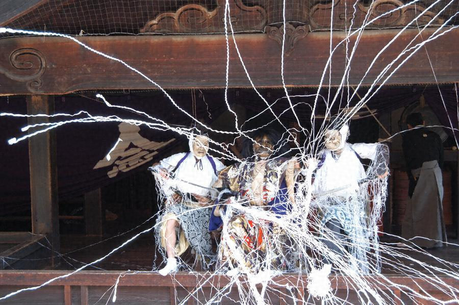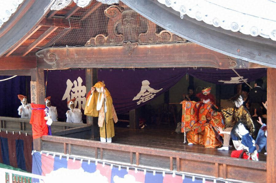 中京区の壬生寺で大念仏会(四月二十一日~同月二十九日)などの折に演じられるもので、寺伝によれば、正安二(一三〇〇)年、壬生寺中興の祖、円覚上人が融通念仏を修し、その念仏の意味を大衆にわかり易く説明するために仕組んだのがその始まりという。上演曲目には、「炮烙割」「桶取」「棒振」「紅葉狩」など二十数番を伝承している。仮面をつけた黙劇で、鰐口、締太鼓、横笛の囃子で演じるもので、独特の演技、演出法を持っている。また能楽とくに狂言の変遷過程を知る上でも、我が国の芸能史上重要な地位を占めるものである。