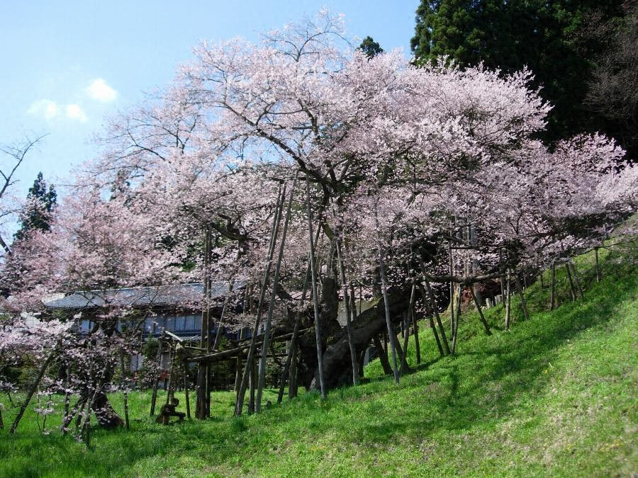 S48-05-151[[臥竜]がりゅう]のサクラ.txt: 曹洞宗大幢寺の境内の南面する斜面にあるエドヒガンの老大木で、樹高15メートル、地上1.5メートルの幹囲7.3メートルに、4本の太い支幹が東西20メートル、南北29メートルの枝張りをなして伸び広がっている。このうち、南にのびる支幹は一旦匍匐して立ち上がり、臥竜のサクラの名のおこりである特有の樹容を生み出している。4月下旬いっせいに開花して美観を呈する。エドヒガンの名木老樹として有数のものである。
