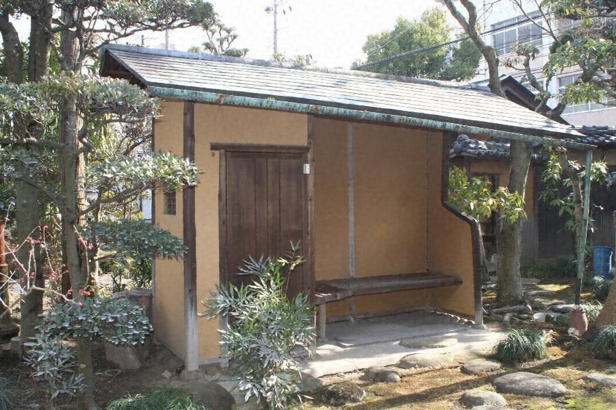 庭園内、茶室の北東に位置する。南北棟の招造で、銅板葺。桁行2.9m梁間0.97m。西面南半部に腰掛、北寄りに物置を設ける。土壁で、東面は腰を杉皮張とする。床は三和土。垂木は丸太と小竹を交互に配し、野地は杉皮を見せる。端正な意匠になる待合。