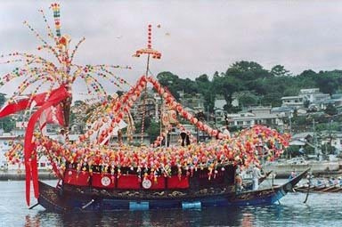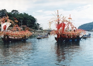 貴船神社の船祭りは、華やかな花飾りや吹き流しで飾られた小早船と神輿船などが櫂伝馬に曳かれ、海上渡御する船祭りの行事である。27日は仮殿へ海上渡御して神迎えを行う。この際、櫂伝馬による船競漕があり、御船歌などもうたわれる。その後、花山車と呼ばれる花傘万燈の一行が町内を巡る。巡行では要所要所で鹿島踊りが奉納される。28日も神輿の町内巡行に続いて、花山車の一行が町内を巡り、夕方、仮殿から神輿が神社へ還御する。(※解説は指定当時のものをもとにしています)