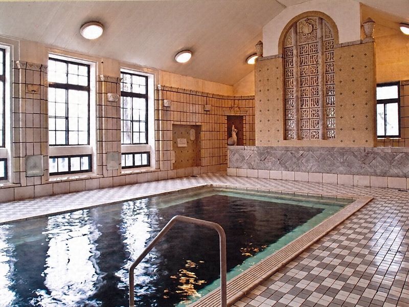浴場の内部は、大浴室を中心にステインドグラスや彫像などで華やかに飾り、また会館の内部は150畳敷の大広間(おおひろま)を中心とした伝統的な和風のつくりとする。