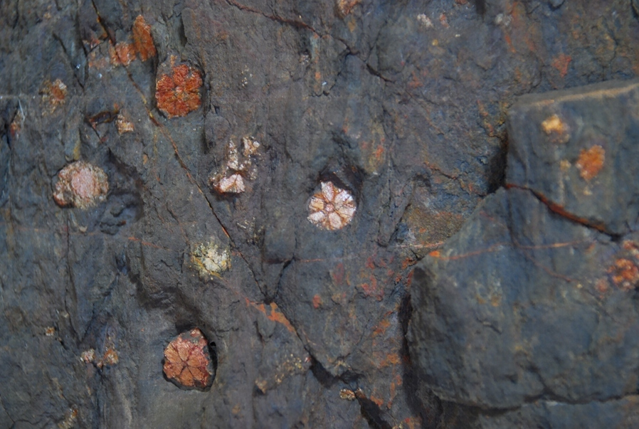 花崗石ト粘板岩トノ接觸部ニ胚胎セル接觸鑛物ニシテ六角柱状ノ透入、三連晶ヲ成シ所謂櫻石ト称セラルルモノナリ 本邦産地中 此ノ地ニ於テハ能ク其ノ結晶構造及賦存ノ状態ヲ檢スルヲ得ベシ