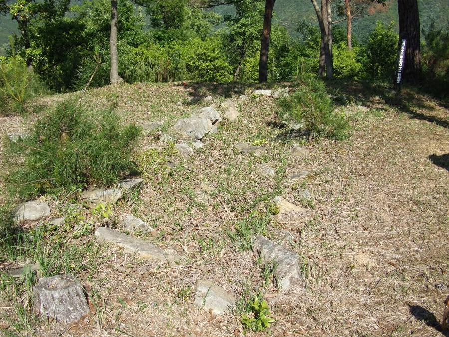 S52-12-036吉島古墳.txt: 揖保川右岸の比高180メートルの急峻な山塊の尾根上に造られた前方後円墳である。全長36メートル、後円部径15メートル、前方部幅6.5メートル、後円部を平野側に向け、前方部端には5メートル程の尾根筋を切断した痕跡がみとめられる。埴輪・葺石はみられない。後円部には古墳主軸に斜交する竪穴式石室があり、長さ5.3メートル、幅1.2メートルで割石と河原石をもって築いている。