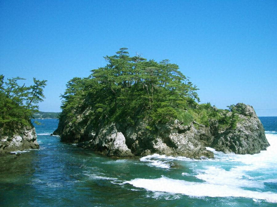 硬質ノ砂岩及頁岩ヨリ成レル斷崖性ノ岬角ナリ岬端ニハ鶴嶋、亀嶋等大小ノ島嶼散在ス崎ノ西側ニ魔ノ瀬ノ大洞窟アリ鶴嶋ト亀嶋トノ間ニハ美ナル磨肌面ヲ表ハセル狹キ水道アリ何レモ波蝕ト斷層トノ関係ヲ示セル絶好ノ標本ナリ又其ノ狹キ水道ノ側面ニハ相並ベル二ツノ潮吹穴アリテ波ノ去來ニ從ヒ高ク水柱ヲ揚ゲ其ノ聲遠ク海上ニ反響シテ雲霧深キトキハ漁船ノ好標識トナルト云フ