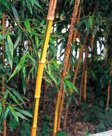 金明竹 Phyllostachys bambusoides Sieb. et Fucc Var. Castillonis Mak. ハまだけノ稈ノ一側面ニ黄金色ノ斑條ノ現ハレタルモノニシテ、斑竹中ノ珍奇ナルモノニ屬ス 本所在地ノ金明竹ハ明治ノ初年ニ初メテ出現セルモノニシテ現時ハ稈ノ太キモノナシ。
