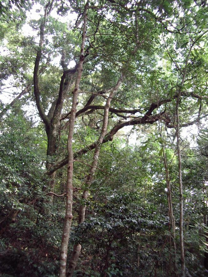 S52-12-062堅田郷八幡社のハナガガシ林.txt: 標高30〜50メートルの丘陵地にある約4ヘクタールの神社林で、ハナガガシ、スダジイなどにおおわれ、ハナガガシがこの林分の主要な構成種となっている。亜高木、低木層には、コバンモチ、ヤマビワ、タイミンタチバナ、ミサオノキ、サツマルリミノキ、クロキなどが生育し、また草本としては、オオカグマ、ベニシダ、ツルコウジなどが多く、コハシゴシダ、キジノオシダ、コヤブラン、シシガシラ、ムヨウラン、エダウチホングウシダなどが自生している。