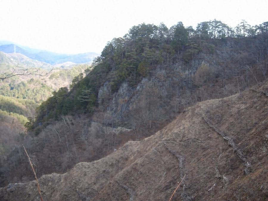 昇仙峽ノ上流ナル奥御嶽地方ニ露出セル數多岩脈ノ代表的ナルモノニシテ京都澤ヨリ東南ニ向テ猫坂ノ東邊ニ至リ其ノ延長一三三二メートル幅ハ一二五メートルヨリ五一.五メートルノ間ニ出入シ水平方向ニ著シキ柱状節理發逹セリ ズサ川ガ猫坂ノ北麓ニ於テ岩脈ヲ横ギル部分ニ於テ殊ニ偉觀ヲ呈ス