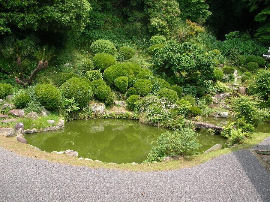 本堂並書院ノ北方ニ自然傾斜地ヲ背景トシテ築カレタル庭園ニシテ池ノ東北方ニ高ク懸レル瀑布ハ九曲トシ東西ニ長ク穿タレタル苑池ノ水源トナレリ又池ニ石橋ヲ架シ園内多少ノ苑路ヲ設ケタリト雖畢竟屋内ヨリノ觀賞ヲ目的トセル書院庭ニ過ギズ而シテ本堂並書院ノ前ニハ京都ニ於ケル寺院ノ庭園ニ慣用セラルヽ白川砂ニ倣ヒテ海濱ノ小砂利ヲ盛リ箒目ヲ施シタリ 蓋シ京都風ノ庭園ガ漸ク地方化セラレントスル過程ヲ窺ヒ得ベキ好適例ナルベシ