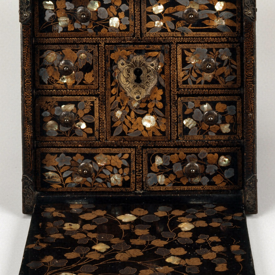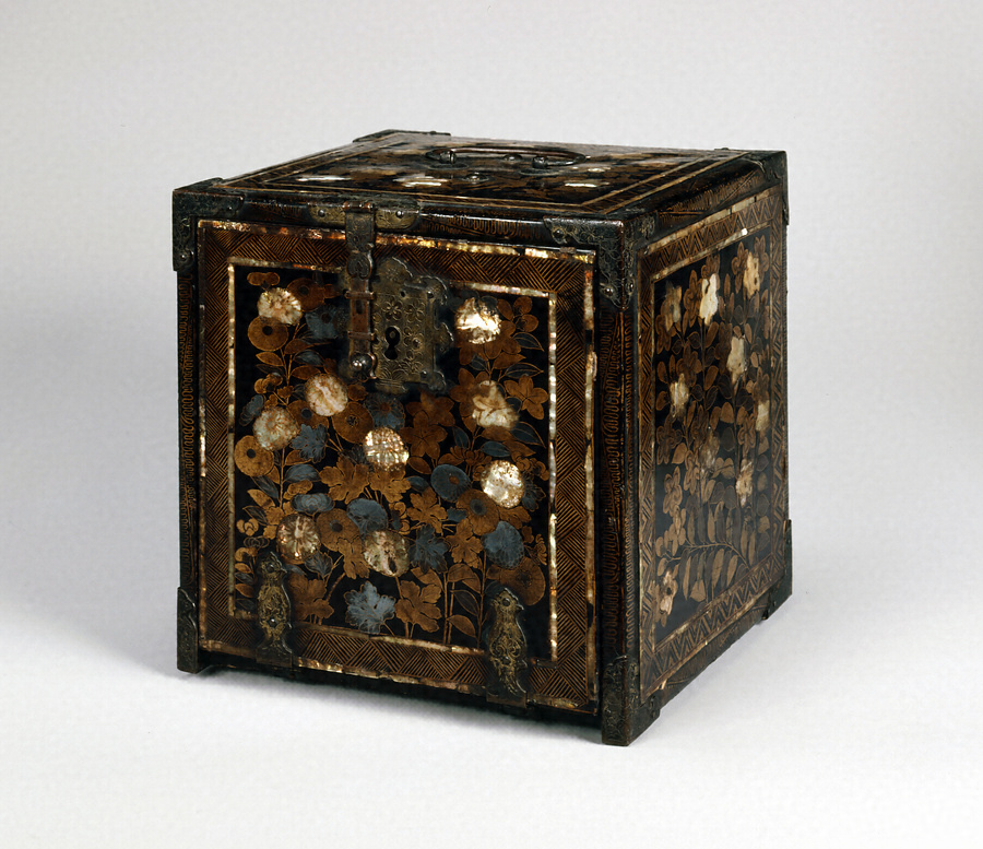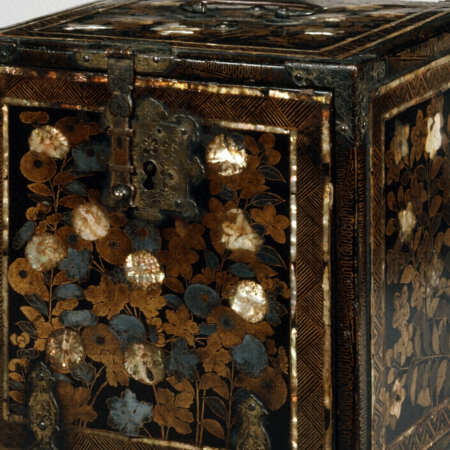 花鳥文と幾何学文様の構成や蒔絵技法、金具の意匠など南蛮漆器の典型のを示し、代表的な作風をよく留めている。