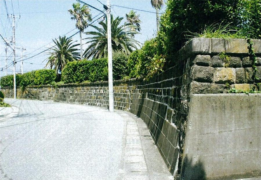 屋敷地の南正面、旧本道沿いに、門を挟んで東側30m、西側25mを測る。縦0.3m長さ0.8mの房州石の切石を6~7段、高さ1.8mに積む。横目地が通る整層積。門付近では厚さ1.7mで、両端部では薄くする。長大な石垣が独特の街路景観をつくる。