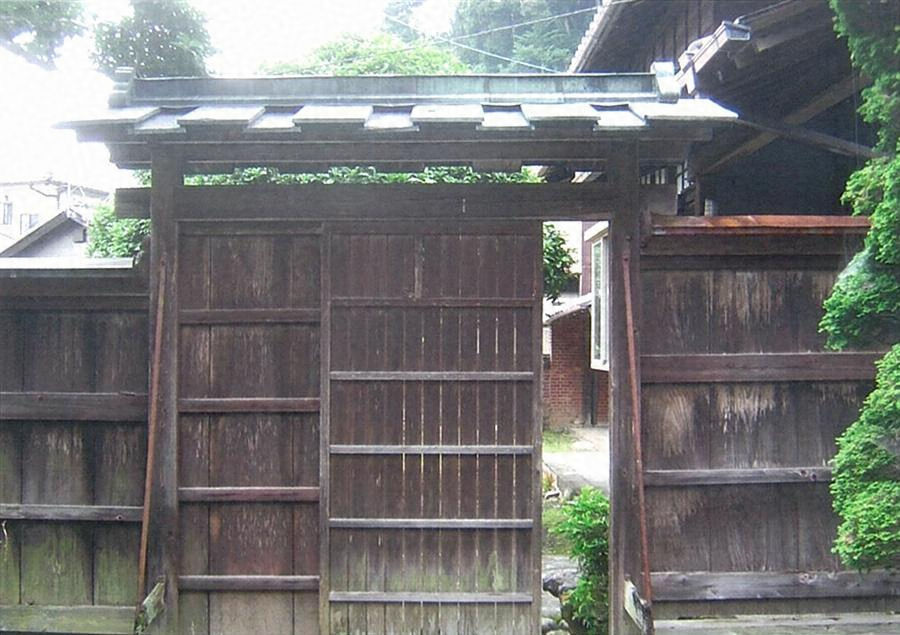 主屋の玄関と応接間の境から南に延びる。延長6.7m、銅板葺及び鉄板葺で、中央に切妻造の門を開く。軸部は土台上に柱を建て、竪板張目板打とする。門は南半間を袖壁として、板戸片引きとする。前庭と中庭を仕切る塀で、落ち着いた屋敷景観をつくる。