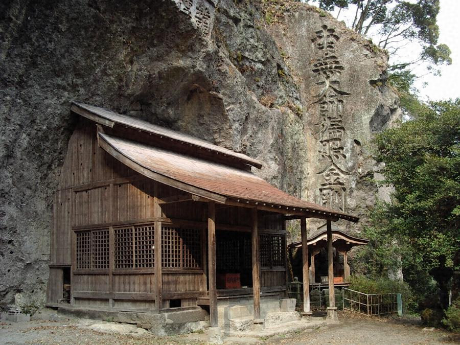大野川ノ西岸丘陵ノ中腹ニアリ凝灰岩ヨリ成レル岩壁ニ不動明王坐像及脇侍ノ立像ヲ半肉彫ニセルモノナリ後世石壁面ニ遍照金剛ノ四大字ト左方壁面ニ塔婆形ヲ線彫セリ