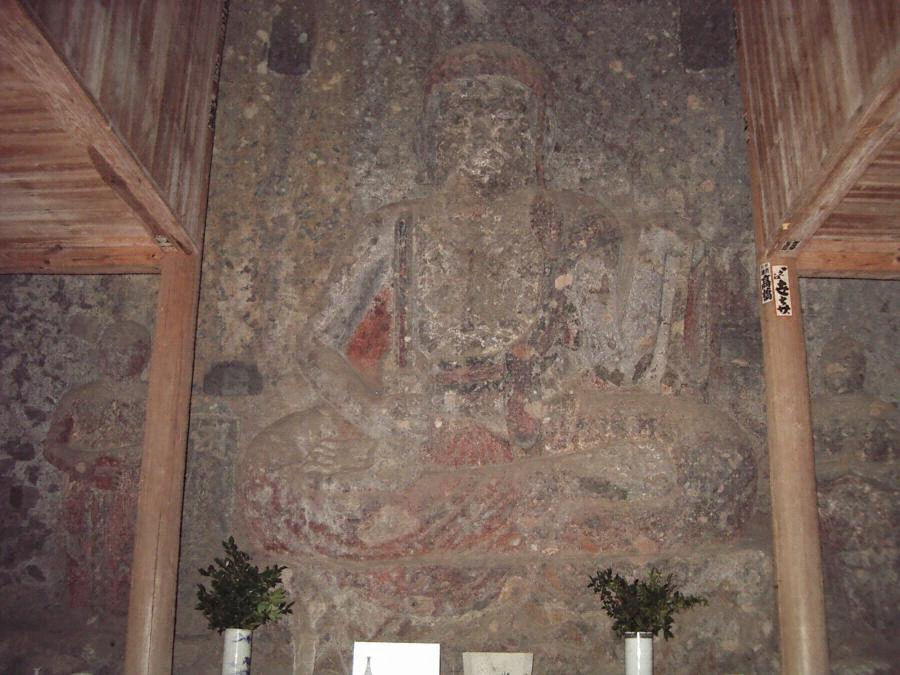 モト赤色顔料ヲ以テ傳彩ヲ施シタル痕跡ヲ存ス前面ニ覆堂アリシカ近年崖ノ一部墜落シテ之ヲ破壞セリ