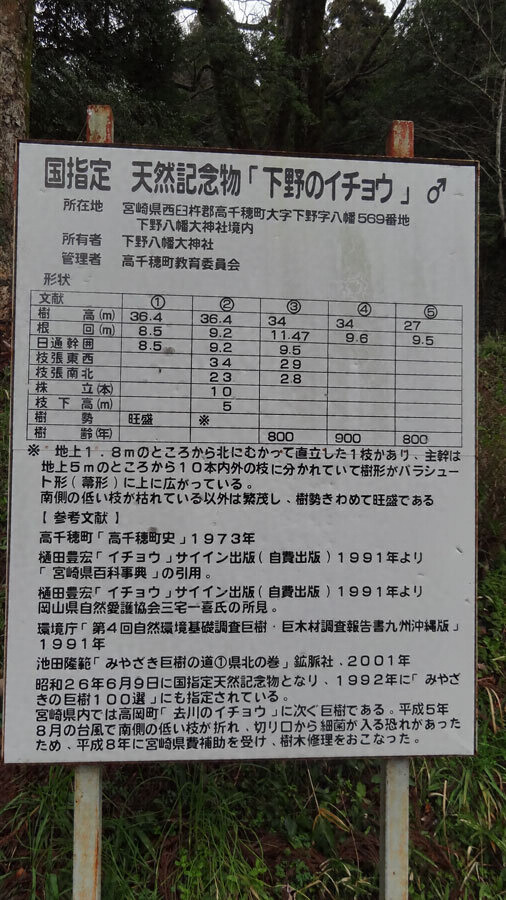 イチヨウは雌株で目通り9.20メートル、根廻りも同様、高さ36.40メートル、地上1.80メートルの所から北に向かって直立した一枝がある。南側の本幹は地上5メートルの所から10本内外の枝に分かれているので全体として上ひろがりのほうき状をなす。以外は枝葉繁茂し、樹勢は極めて旺勢である。イチヨウ巨樹の一である。