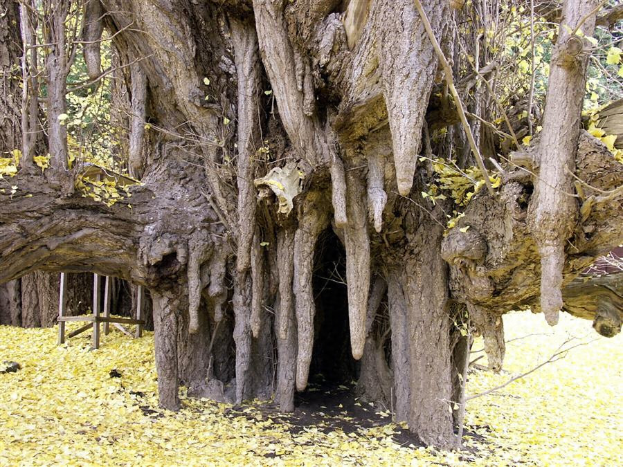 イチョウは裸子植物に属する落葉高木である。中生代に栄えた植物の末裔といわれ、世界各地から多くの化石が発見されているが、現生のものは1科1属1種のみである。日本に自生は無く、中国(安徽省・浙江省)が原産で、室町時代に渡来したといわれている。日本各地の神社や寺院等に植栽されており、種子のギンナンは食用とされている。