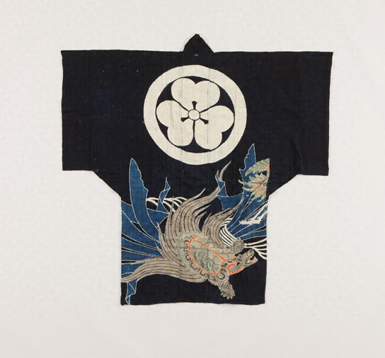 糊筒染した夜着。紋がついていて、特別の家のものであった。