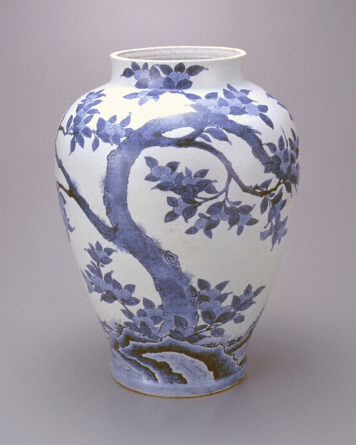 本大壺は、高さ40センチメートルを超す大作ながら、端正な形姿を示し、胴裾から口辺に至る全面に、太湖石から大きく立ち上がる橘樹の図様が、染付の濃染により、余白を残して、見事に描かれる。