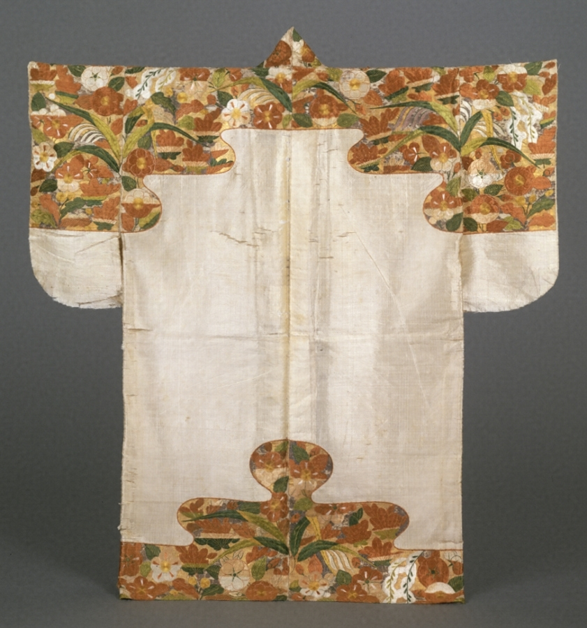 表は白平絹地で肩と裾を雲形に区切り梅・八重桜などの草花文【そうかもん】を紅、萠黄などの色糸で刺繍し、その間に金銀箔をおしている。身幅広く、袖幅狭い小袖で、能の小方の装束として伝えられたものである。初期小袖の形態を示した生ぶなもので、華麗な意匠と保存の完好した甚だ珍しい遺品である。もと奈良金春流保存会諦楽舎に伝来したものである。