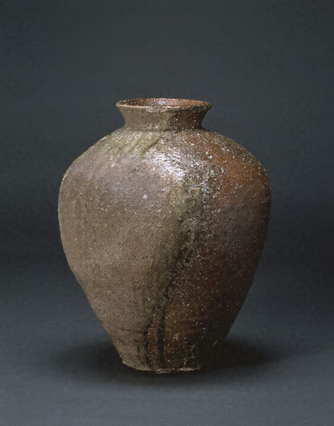 外反する口づくりで、口縁をひねり返して丸く丁寧に仕上げている。典型的な長胴形の壼である。素地は長珪石を多く含んだ土で、全体によく焼き締まっている。火表は降りかかった灰が大きく焦げとなり、その周囲が熔けて鮮緑色の自然釉となって流れ落ちている。火裏側は赤褐色の光沢のある器肌を呈し、長石粒の噴き出しも多い。胴部にはひっつきもあり、焦げ、自然釉、火色と、信楽らしい豪快な景色となっている。