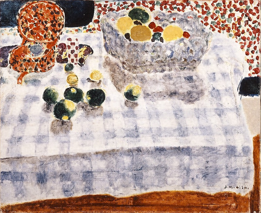 淡い色調のテーブルクロスの中に、赤や緑や黄色の鮮やかな色の果物が描き込まれ、背景は点描により装飾的に描かれて奥へと向かう視線を閉ざしている。格子柄のテーブルクロスは、節子が憧れたボナールもしばしば描いている。格子柄によりテーブルが奥からせり上がる様な感じが強調され、わずかな絵具をキャンバスに擦り付けるように塗ることで、やわらかな印象をもたらしている。ボナールについて節子は「デッサン淡彩などを見ていると、もう常住座臥生活に絵画があって、絵画はボナールの食事をすることのようなものだ。そして色彩の饗宴が渦巻き、思想の火華がたえず奏でられているといった感じを受ける。」(「近代の表現」『美神の翼』)と語っている。日常の生活の中で身近なものから絵画のモチーフを得て、常に豊かな想像力をもって絵画的な思考をめぐらせようとしていた姿勢がうかがえる。ボナールは1920(大正9)年頃から美術雑誌を通じて日本に紹介され、1940(昭和15)年には391点もの図版が掲載された本格的な画集も出版された(「ボナール展」1997年、図録より)。