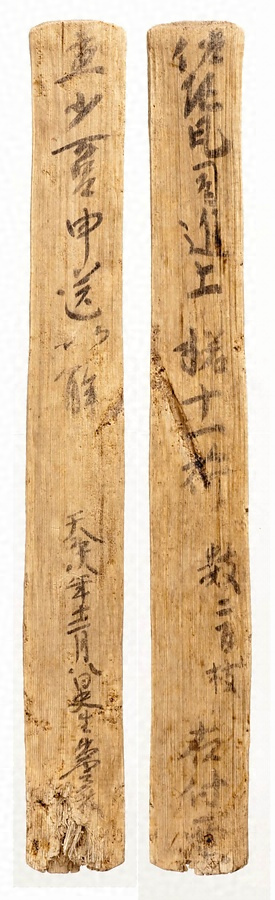 平城宮の北の平城(なら)山(やま)丘陵には奈良時代に瓦窯が操業していた。そこにあった佐紀瓦司が麻呂邸に11個に小分けされた? (しもと)(小枝)二百本を進上してきた際の木簡。このとき実際の輸送に携わったのが粟直(あわのあたい)少万呂(すくなまろ)で、この木簡を書いたのは史生の出雲某であった。瓦窯には薪用に小枝がたくさん用意されていたと考えられ、寒い時期の麻呂邸を暖めるためにも使われたのであろう。