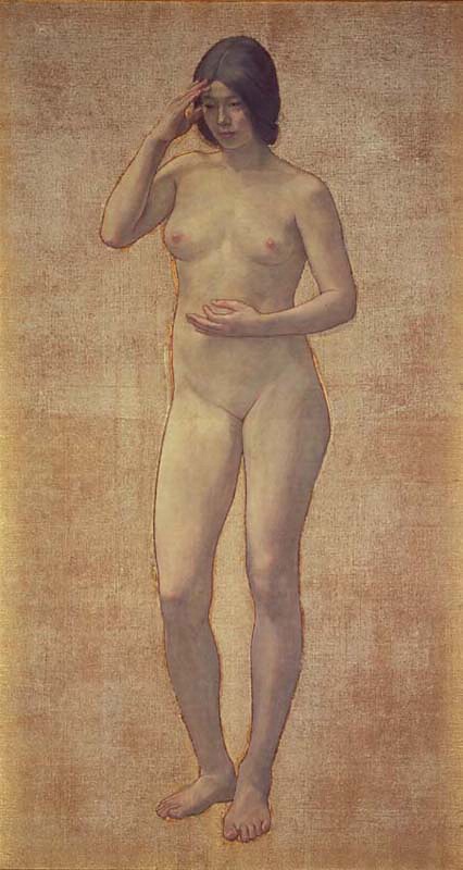 明治30(1897)年、第2回白馬会展に《智・感・情》の題で出品した三部昨。のち、三画面とも加筆され、明治33年パリ万博に《裸婦習作》として出品され、日本の洋画に与えられた賞としては最高の銀賞を受けた。日本人をモデルとした初めての油彩画による裸婦であり、明治28年、第4回内国勧業博覧会の出品作《朝妝》をきっかけに起きた裸体画非難の声が再燃したなかで制作、発表された点、また、その寓意的画題と象徴的ポーズからも明らかなように、黒田が日本に根づかせようとしたいわゆる構想画(理想画)、それも極めて壁画的要素が強い点など、この作品が当時の洋画壇に与えた衝撃は少なくない。また、黒田の画暦においても、《昔語り》が戦災で焼失した現在、完成された構想画としては現存する唯一のものである。黒田自身の言葉によれば「当初画家の三派なる理想、印象、写実の意を表わさん」と着想したもので「理想を智、印象を感、写実を情に改めた」のだという。しかも、ここでの「感」はSensやSensationではなくImpressionを意味していたともいわれる。いずれにせよ、画題、ポーズを含めて、三幅対という画面形式、装飾的な金地背景など、西洋・日本の両文化を踏まえ、明治洋画に新たな方向を示そうとする意欲作であった。
